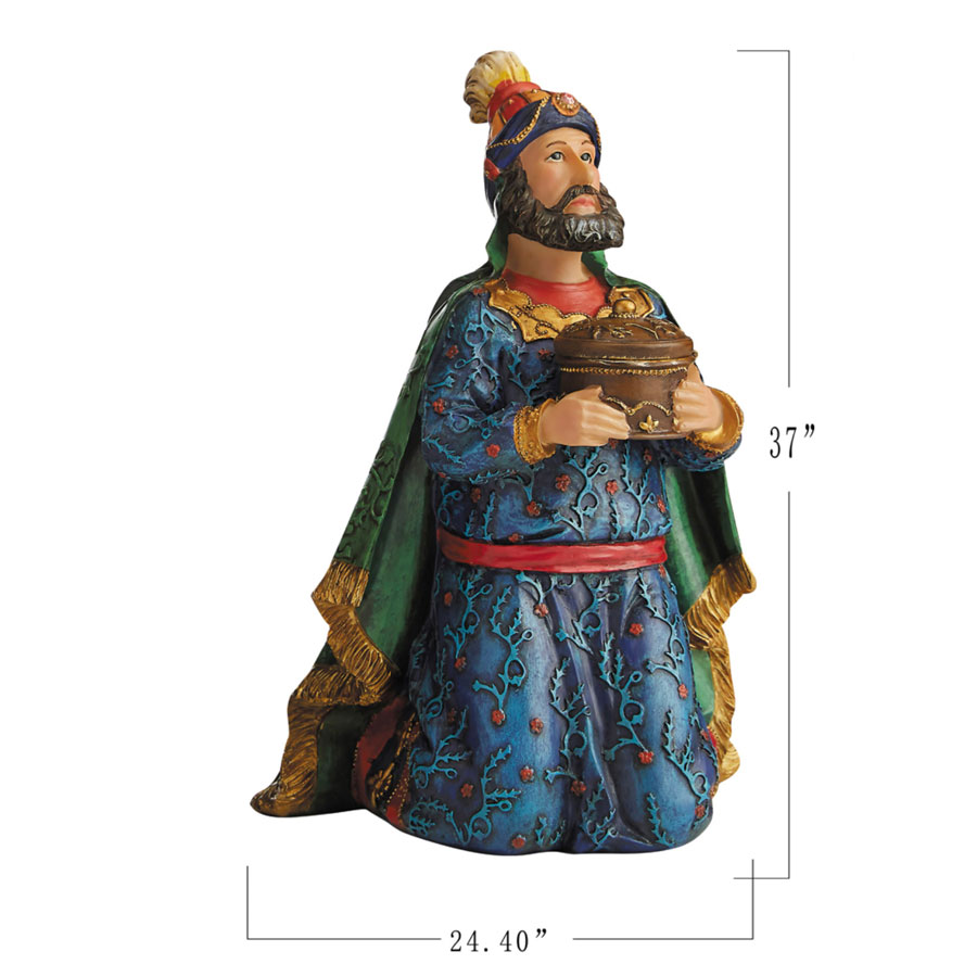 This is an all metal, two dimensional four piece Three Kings and Resting Camels. It includes King Gaspar, King Melchior and King Balthazar and the resting Came. King Balthazar is the tallest figure at 51.5 inches. The all metal pieces are printed with high resolution paint that resists fading. These super hi resolution images give the remarkable illusion of the pieces being three dimensional and the details show with such clarity that the Christmas Story is truly brought to life. Set up is a snap and each pieces comes with durable, three pronged metal stakes to anchor them to the ground. Each piece also comes with brackets that can be attached to rods (not included) to help stabilize the pieces in windy areas.