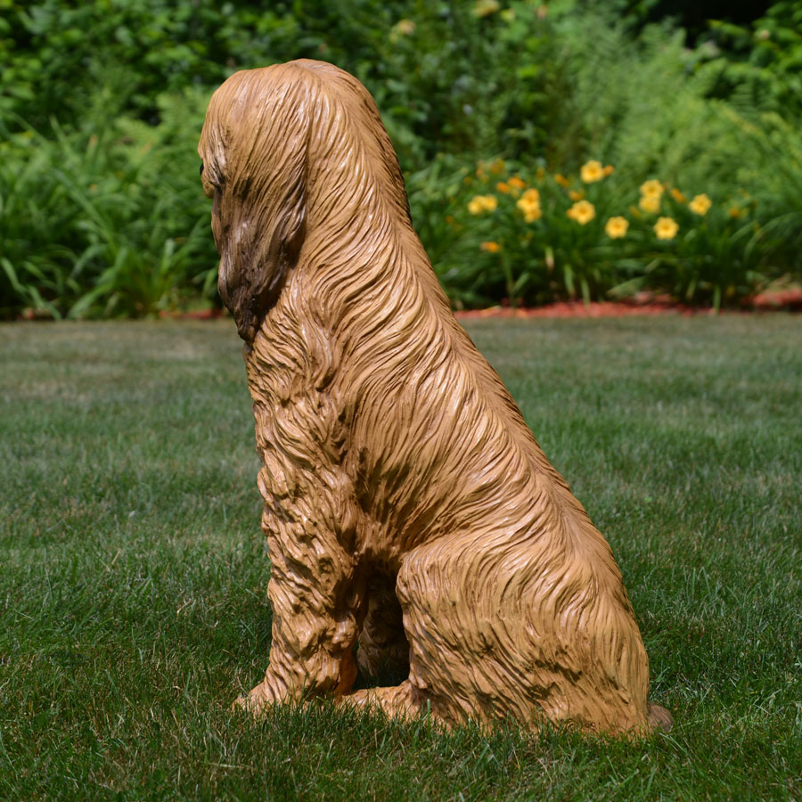 The Afgan Hound Statue by Farmet depicts an aristocratic dog of great beauty. The design presents the dog in a sitting position with its head raised and eyes alert. The statue is imported from Italy and is made using the rotational molding technique that allows for excellent detail and a super durable finish. The nearly unbreakable figure is resistant to sunlight and can withstand temperatures ranging from -112 degrees Fahrenheit to 140 degrees Fahrenheit. The dog has a full-color painted finish. It is made using recyclable materials in deference to the environment.