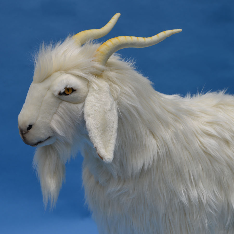 Cashmere plush Goat. The "coat" of the Goat is meticulously cut by hand, and manufactured in small lots to Hansa's exacting specifications. Gentle ears, realistic wool coat, soulful eyes and face are lovingly detailed to give the Goat the life-like look that is unmistakably Hansa. The Goat is exceptionally strong, yet lightweight, with a structural metal frame and can even be "ridden" by anyone up to 150 lbs. The recommended age for Hansa animals is 3 and up to comply with ASTM93 safety standards. The Goat goes with Nativity Sets Items 60550 and 60553.