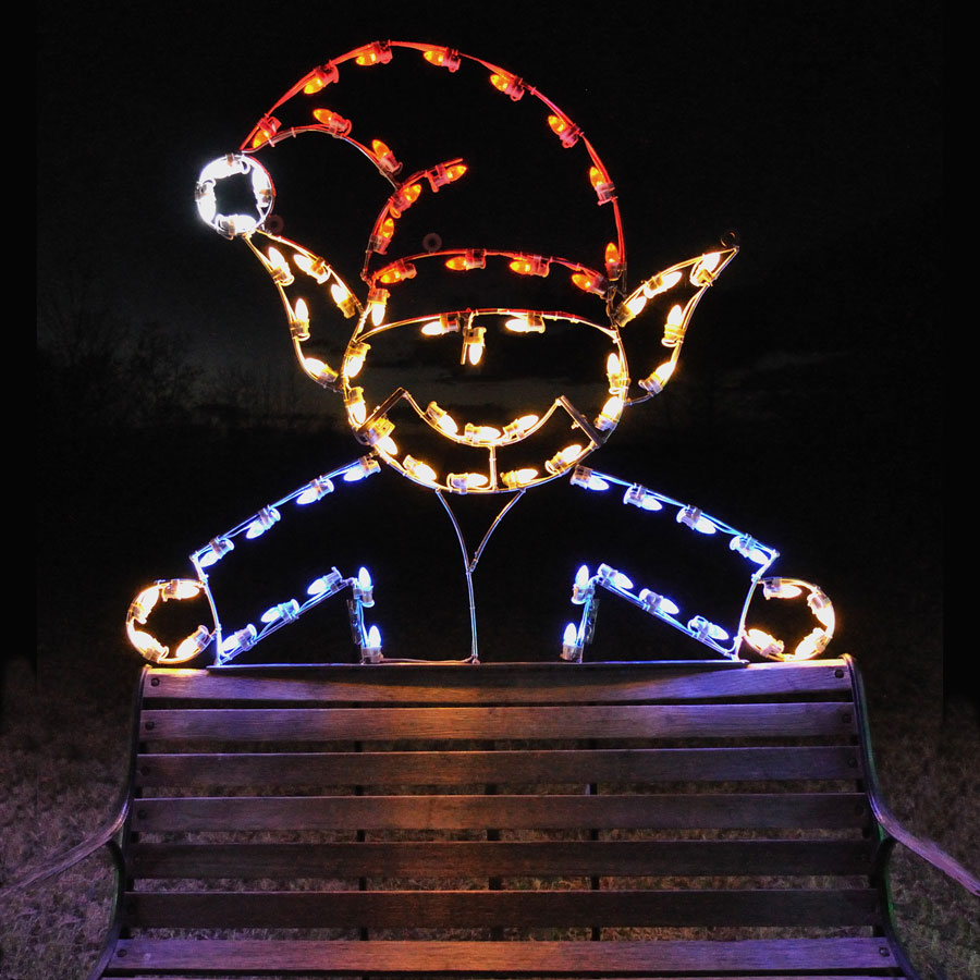 Elf Peeking Light Display professionally designed and built by hand using the highest quality materials, including commercial grade lights. This Elf display arrives prelit and ready to use. Made in Canada. Designed to be inserted into the ground.