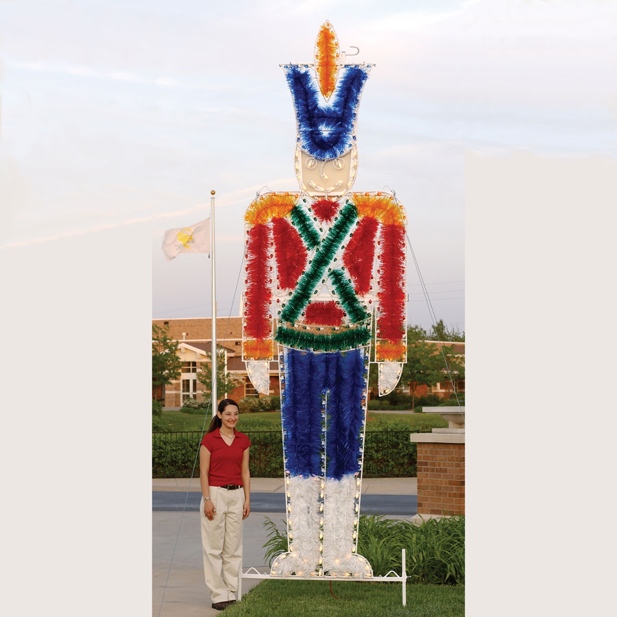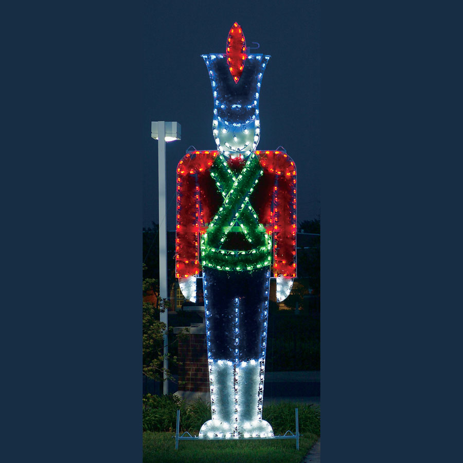 Christmas Toy Soldier Light Display professionally designed and built by hand using the highest quality materials, including commercial grade lights and fine cut garland. This Toy soldier display arrives prelit in several sections that bolt together. Designed to be ground mounted. Use the adjustable feet provided to mount your display on the ground and use guy wire to support the display.