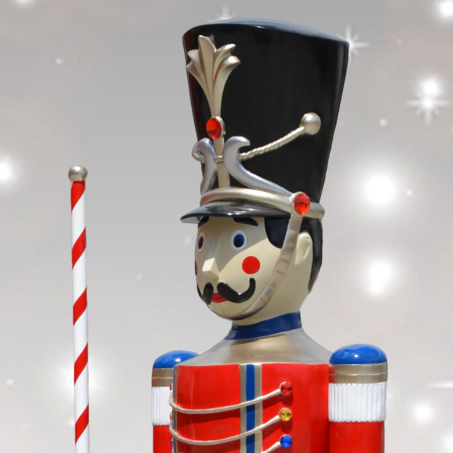 Everybody who comes by your home or business will be impressed with the stature that this giant Christmas toy soldier brings to a display. With chip-resistant fiberglass construction and a stable pedestal mount, he will stand attention proudly for many Christmases. The red overcoat and blue uniform pants are strikingly detailed, and this 10-foot toy soldier figure has a candy cane baton in his right hand as if ready to march away. Combine childhood joy with adult wonder at hotels, zoos, convention centers and more.