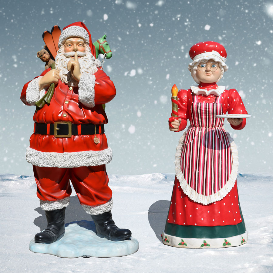 Santa and Mrs. Claus are coming to your town! Our life-size Indoor/Outdoor Santa and Mrs. Claus Statues will be the perfect finishing touch on any commercial or residential display. Decked out in the classic vibrant Santa outfit, he has a sack of toys and Mrs. Claus has a candle and cookies for those boy and girls who have been good. Each Life-Size Santa and Mrs. Claus Figure is made of fiberglass with a fade-resistant topcoat and comes with floor/ground mounting plates for added safety.