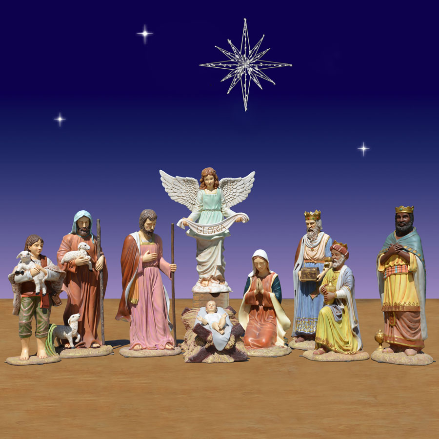 The life-size Nativity Scene includes 9 beautifully crafted figures. The scene tells the story of the Nativity and includes important figures such as the Holy Family, the Three Kings, the Angel of Gloria and the Shepherds. The beautifully crafted piece is part of the Christmas Night Nativity Collection of high-quality religious figures and makes a spectacular addition to any Christmas display. Additional animals from Christmas Night Inc may be purchased separately. Note InLiteFi Star Item number 41090 not included...SCROLL DOWN IF YOU WISH TO BUY this star