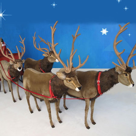 Get everything you need for an enchanting and memorable holiday display in your home or business with this striking Life-Sized Santa, Sleigh and Four Reindeer set. It includes a durable fiberglass sleigh with metal runners that can hold up to 250 pounds, a realistic fiberglass Santa and four Hansa reindeers made with hand-cut fabric from the Portraits of Nature collection. The ride-on reindeers and sleigh are designed for interactive use, so you can invite children to go for a ride with Santa. Designed by Christmas Night Inc. with pieces by Heinimex and Hansa, this is the ideal all-inclusive Santa set for shopping malls and other businesses.