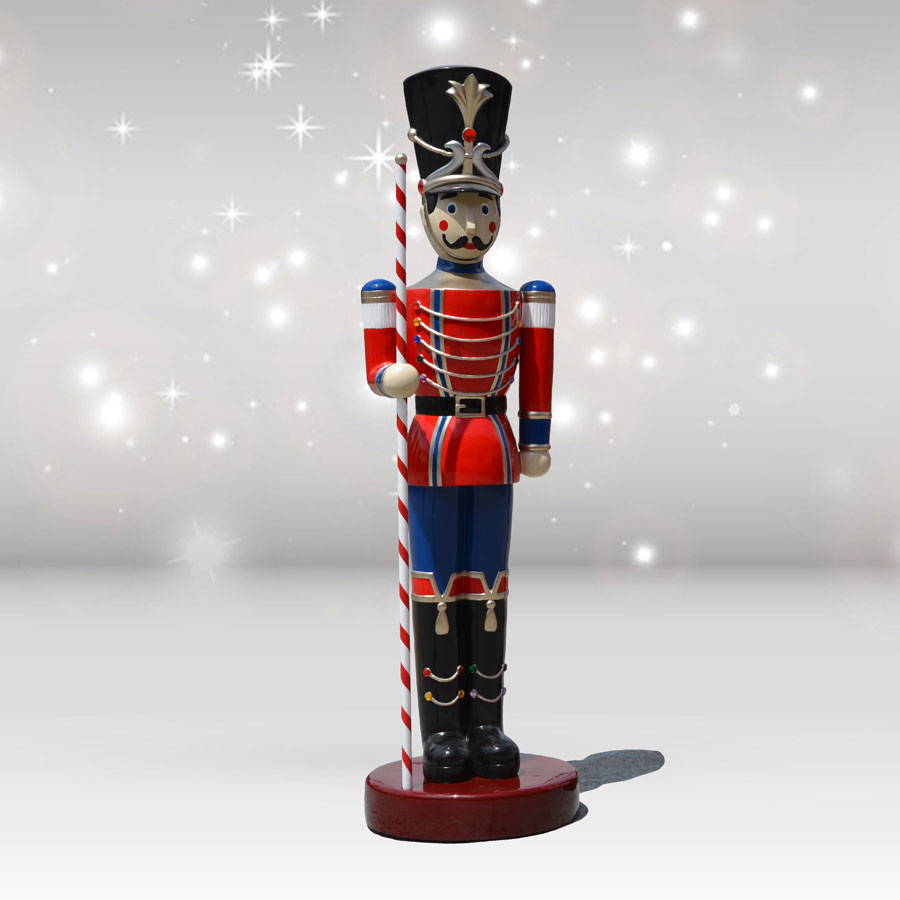 Every Christmas display needs a ringleader, and our life-size Christmas toy soldier with a baton is just that. This 6.5-foot version of the classic holiday toy will give everyone a grand welcome at the head of your walkway or doorway, and it can also stand guard around Christmas trees and fireplaces. The durable fiberglass body is strikingly detailed, and the candy cane baton in his right hand is reminiscent of a holiday parade. Your life-size toy soldier and baton manufactured by Heinimex will really be larger than life!