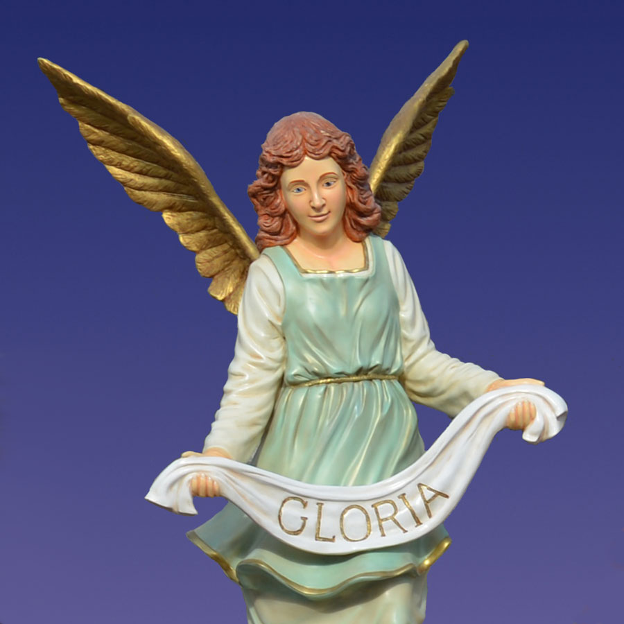 Display the beautiful Outdoor Angel Gloria as part of your life-size Nativity scene. The elegantly crafted angel figure is part of the Christmas Night Nativity Collection of figures. The design portrays the angel with vibrant red hair, golden wings, a flowing dress and a sash bearing her name. In the story of the Nativity, Gloria is the angel that watched over the Christ Child during His first day on Earth.