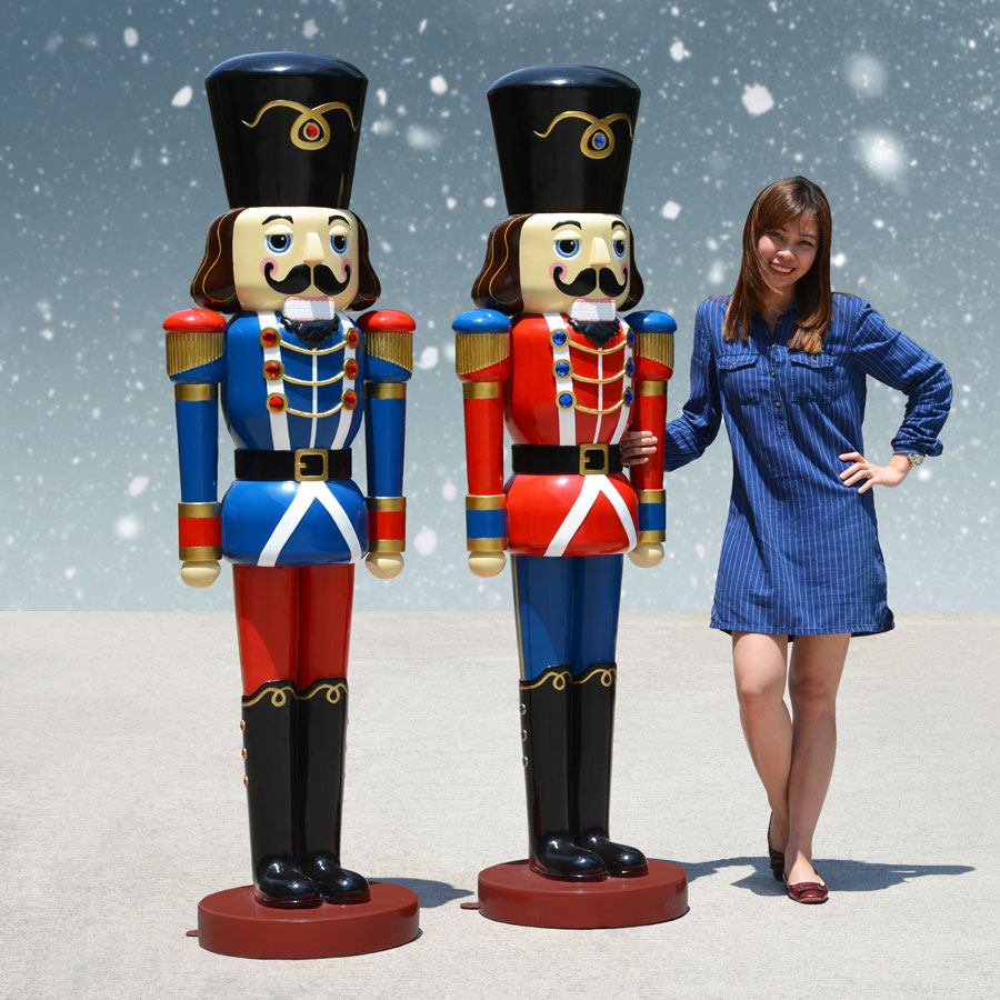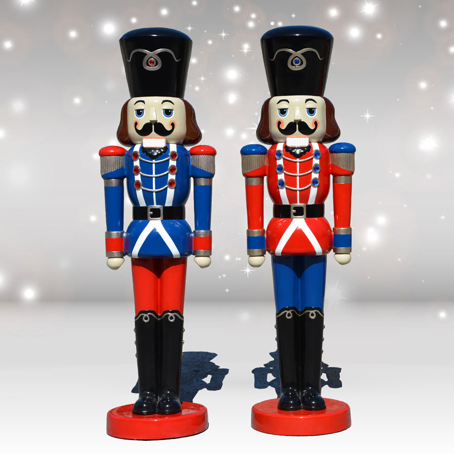 Since the Christmas story The Nutcracker and the King of Mice was published in the 1800s, the nutcracker has adorned Christmas décor, ornaments and indoor and outdoor scenes with flair. Our gold-gilded soldiers wear bright blue and red overcoats, and stand at attention throughout the holiday season. Suitable for indoor use as well, these two-life-size nutcracker soldier will make a fine addition to your residential or commercial Christmas décor.