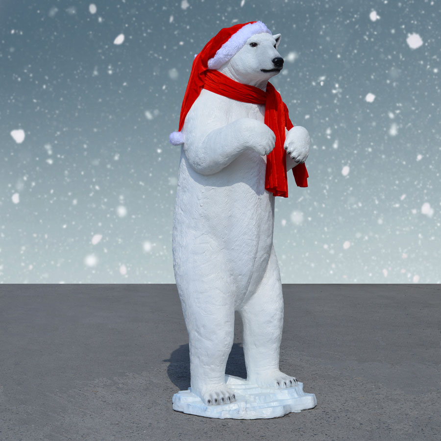 Add to your whimsical winter wonderland with a Polar Bear dressed in Santa hat and scarf. Heinimex's life-sized Christmas polar bear (83 in.) features rich detail and character from its charming facial expression to its textured fur. This outdoor polar bear figure is a popular choice among homeowners, businesses and zoos and is crafted from durable, chip-resistant fiberglass material and then finished with a topcoat to help it withstand the elements.