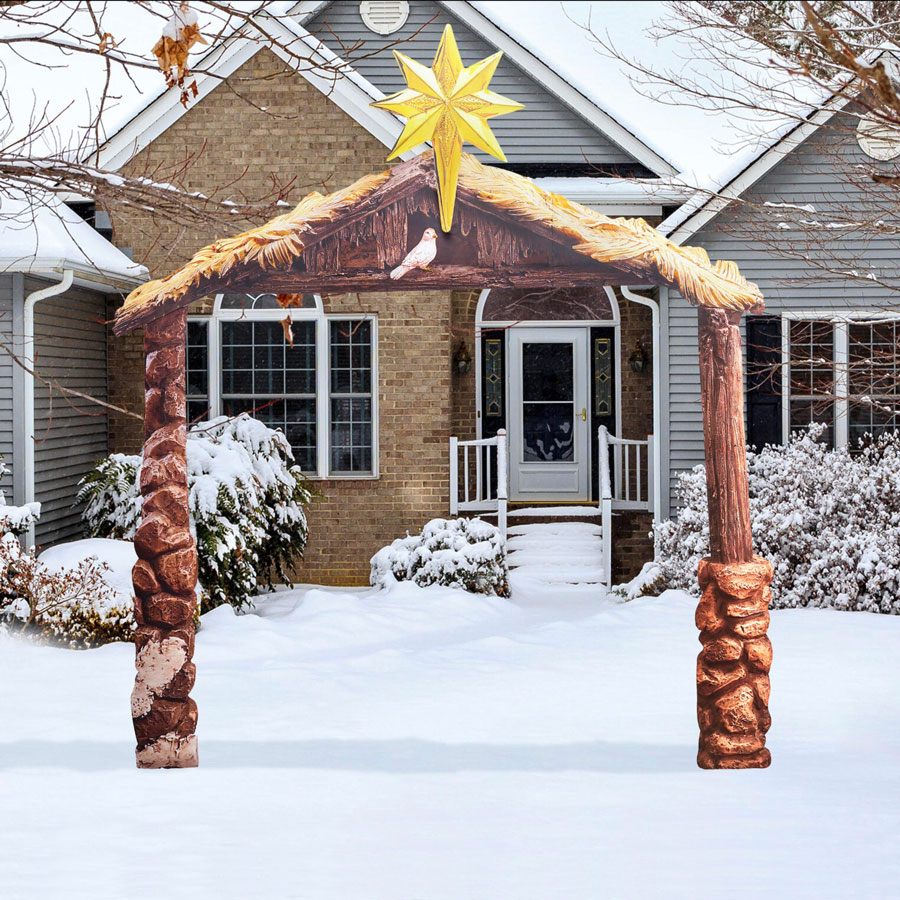 Two-dimensional outdoor Stable and Star. The flat metal stable is printed with high resolution paint that resists fading. Details such as the thatched roof, stone pillars and dove capture and bring the Christmas story to life. It is designed to complete the Three Kings Real Life outdoor Nativity set. The stable folds for easy storage.
