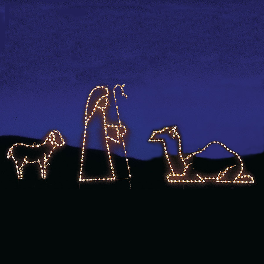 Your lighted outdoor nativity scene won't be complete without this shepherd accompanied by a lamb and camel. These figures are lit by 200 mini LED lights. Each one is easy to set up in any yard at a home, church or business and as it comes with floor stands for displaying on a soft or hard surface.