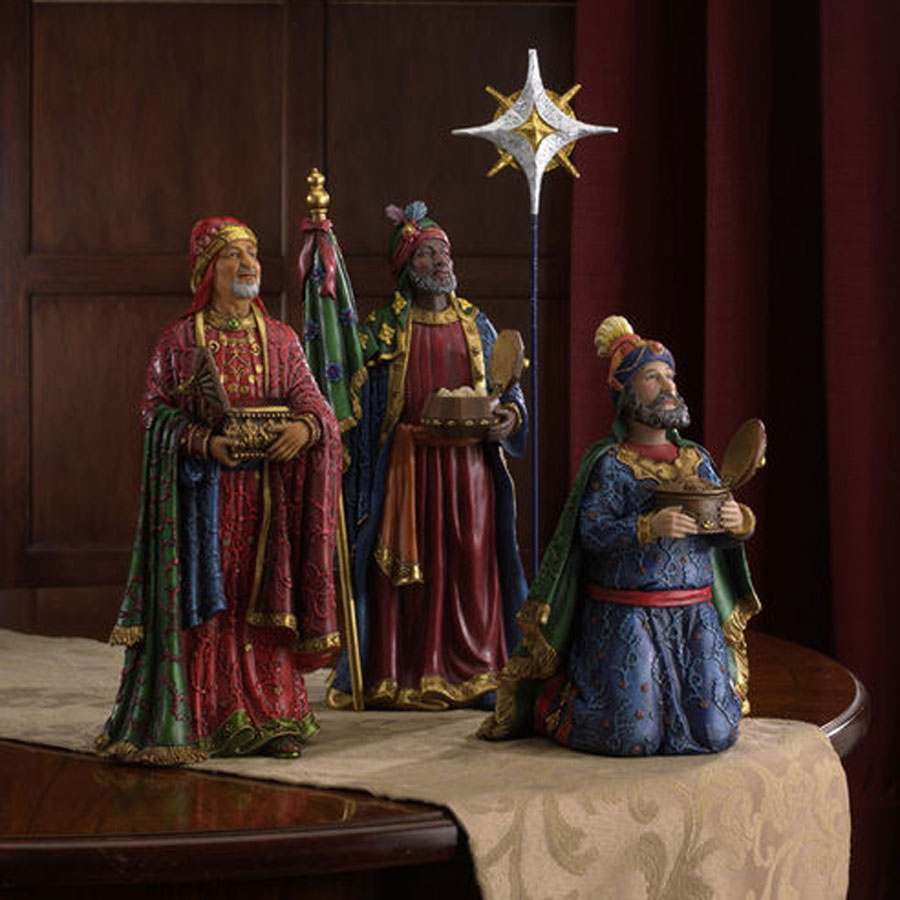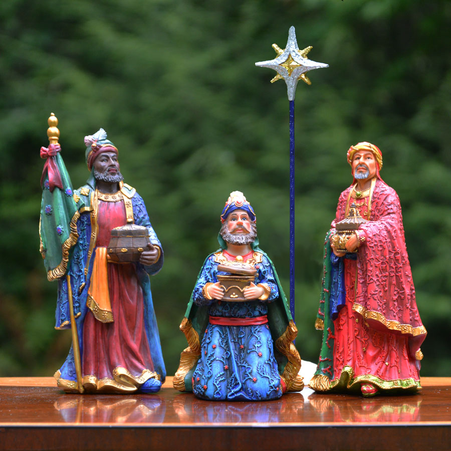 As the centerpieces of the entire Three Kings Gifts Real Life Nativity Collection, these remarkable Three Kings nativity figures bear real-life gifts, including 23-karat gold floating inside King Melchior's glass vial, authentic Arabian myrrh within King Gaspar's chest and pure Omani frankincense in King Balthazar's trunk. The set also includes a detailed depiction of the Star of Bethlehem for a truly inspirational nativity display. Figures are hand-painted and made from lasting polymer resin for years of indoor use.